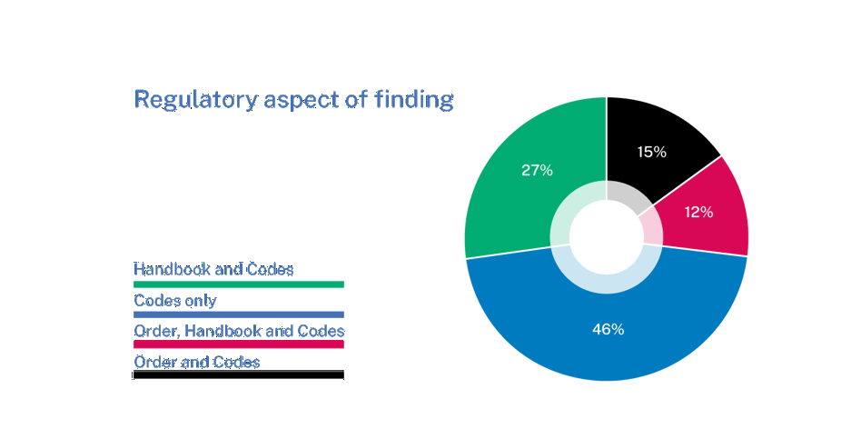 There were findings identified at 10 out of the 11 Registered Persons that were examined. The following graph shows how the 41 findings have been categorised as non-compliant with the Order, or a statutory obligation or regulatory requirement described in the Handbook, or the Codes, or was relevant to all three regulatory requirements[2].