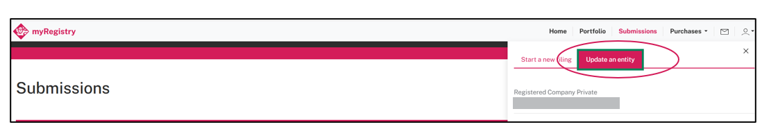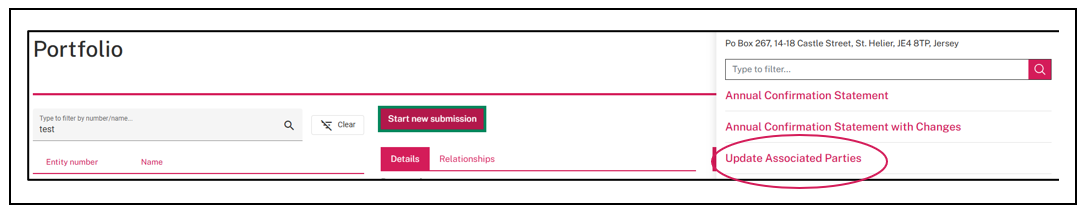 1. Go to your portfolio. Search for and select the entity that requires a change. Select ‘start new submission’ and choose 'update Associated Parties' at the bottom of the list.